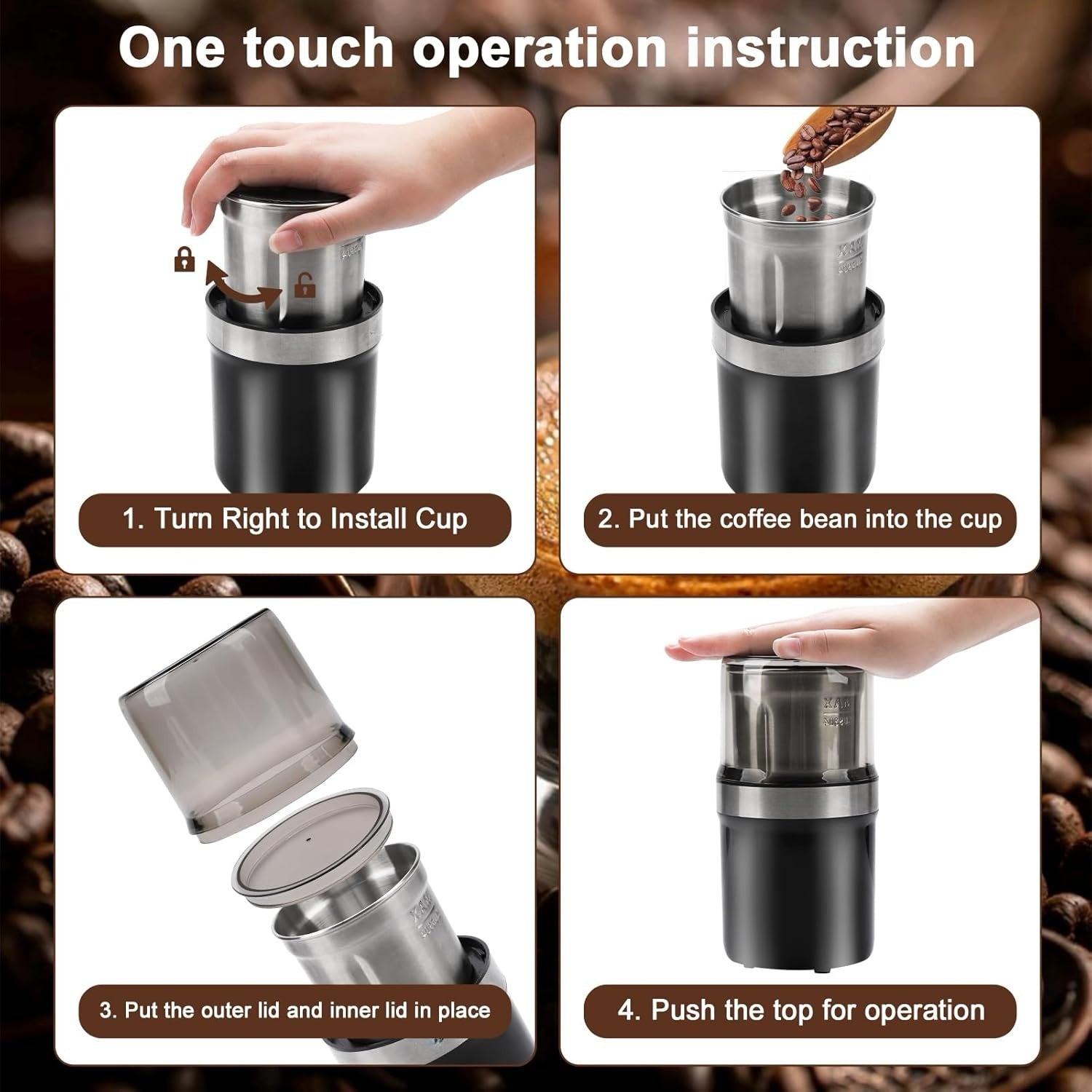 It features a 100g stainless steel cup, perfect for grinding enough coffee beans to brew multiple cups in one go.