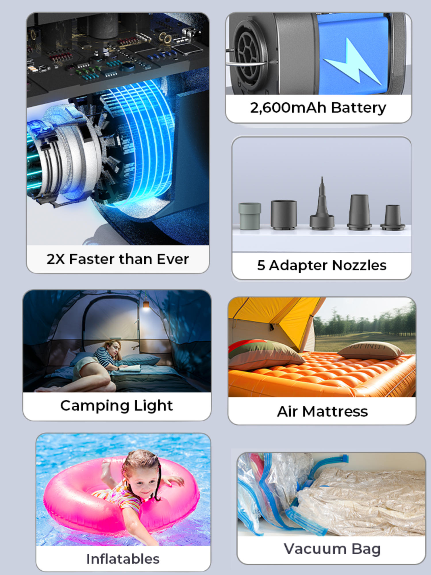 Our portable electric air pump is designed for convenience and speed. With a powerful 2600mAh rechargeable battery, multiple nozzle options, and a compact design, it delivers quick inflation and deflation whether you’re at the campsite, pool, or on the go.