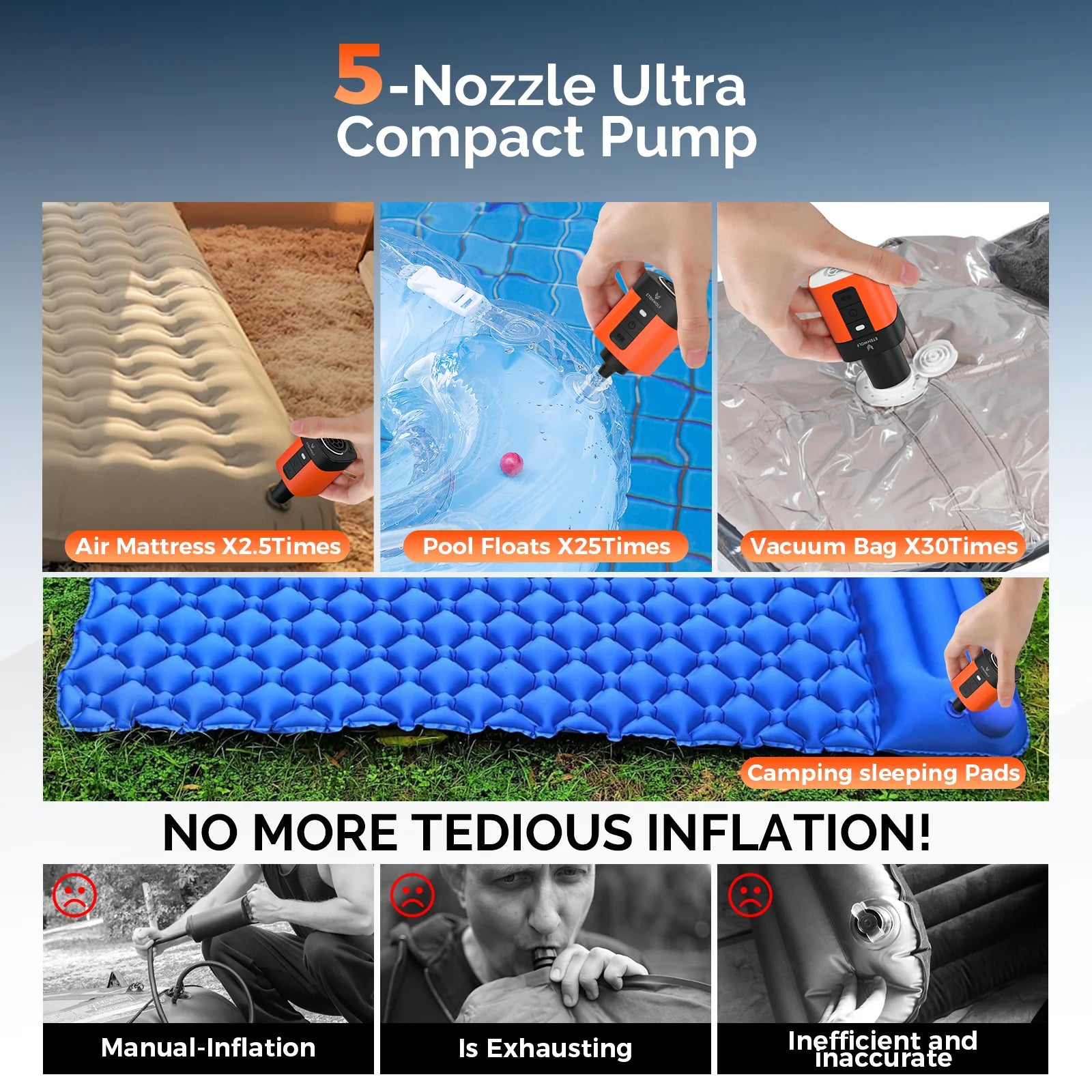 Designed for adventure, this lightweight electric air pump packs strong airflow in a portable size. With a 2600mAh rechargeable battery and multiple nozzles, it inflates and deflates air mattresses, pool floats, and sleeping pads in minutes—making travel and camping effortless.